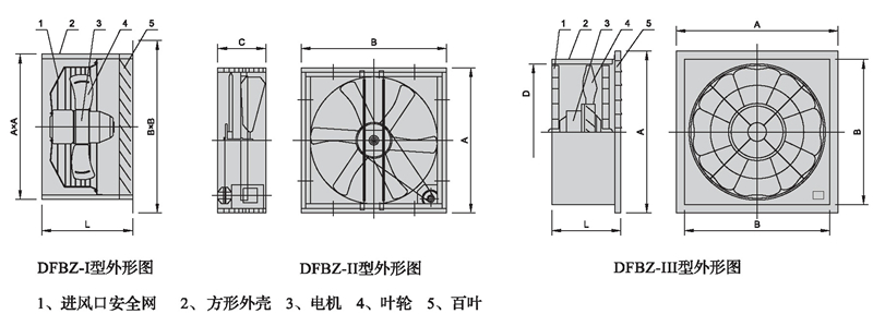 DFBZ-I型為采用內轉子電機直聯傳動結構形式、DFBZ-Ⅱ型采用內轉子電機、皮帶傳動結構形式,DFB-Ⅲ型為采用外轉子電機直聯傳動結構形式。可根據用戶要求制威防腐防爆型。